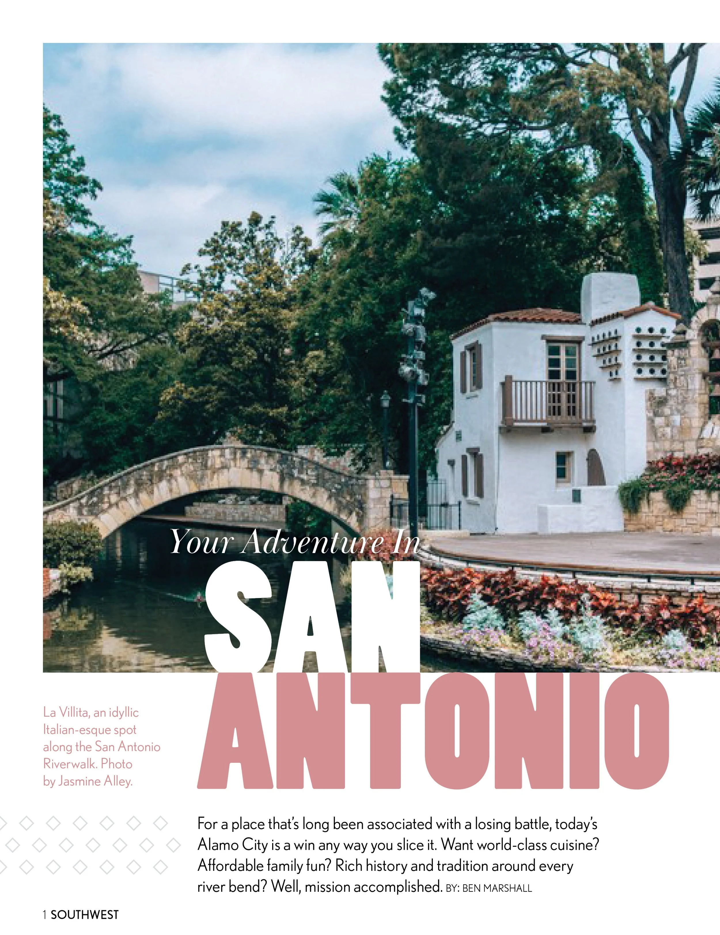 A four-page editorial layout with copy originally written for Southwest: The Magazine, which focused on a travel destination and its unique points of interest - in this case, San Antonio.